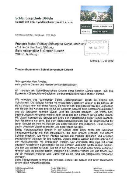 In Zusammenarbeit mit der "Mittelsächsischen Theater- und Philharmonie gGmbH" ging der "Förderpreis Theater + Konzert" für die Saison 2018/2019 an die Schloßbergschule Döbeln, Kindergarten Geringswalde, Förderschule Zettlitz, Förderschule Roßwein, Förderschule Waldheim 400 Schülerinnen und Schülern wurde die Möglichkeit gegeben, das Freiberger Theater 1.485 mal zu besuchen. Der pädagogische Dienst des Theaters organisierte die nötigen Begleitmaterialien und führte Vor- oder Nachbereitungen durch. Auch der Konzertdramaturg war an dieser pädagogischen Arbeit beteiligt.