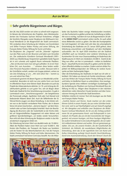 "Nach der Erbschaft: Lommatzsch bekommt zwei Kunstwerke für den Marktplatz geschenkt", Sächsische Zeitung 03.05.2025